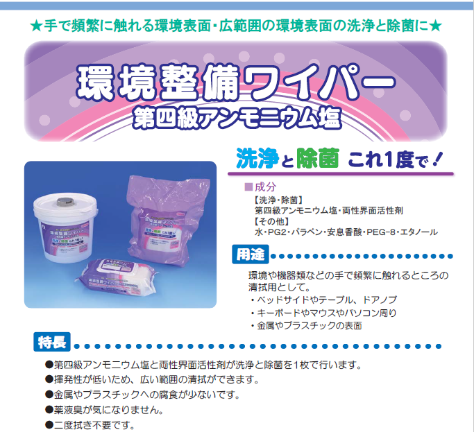 ・揮発性が低いため、広い範囲の清拭ができます。